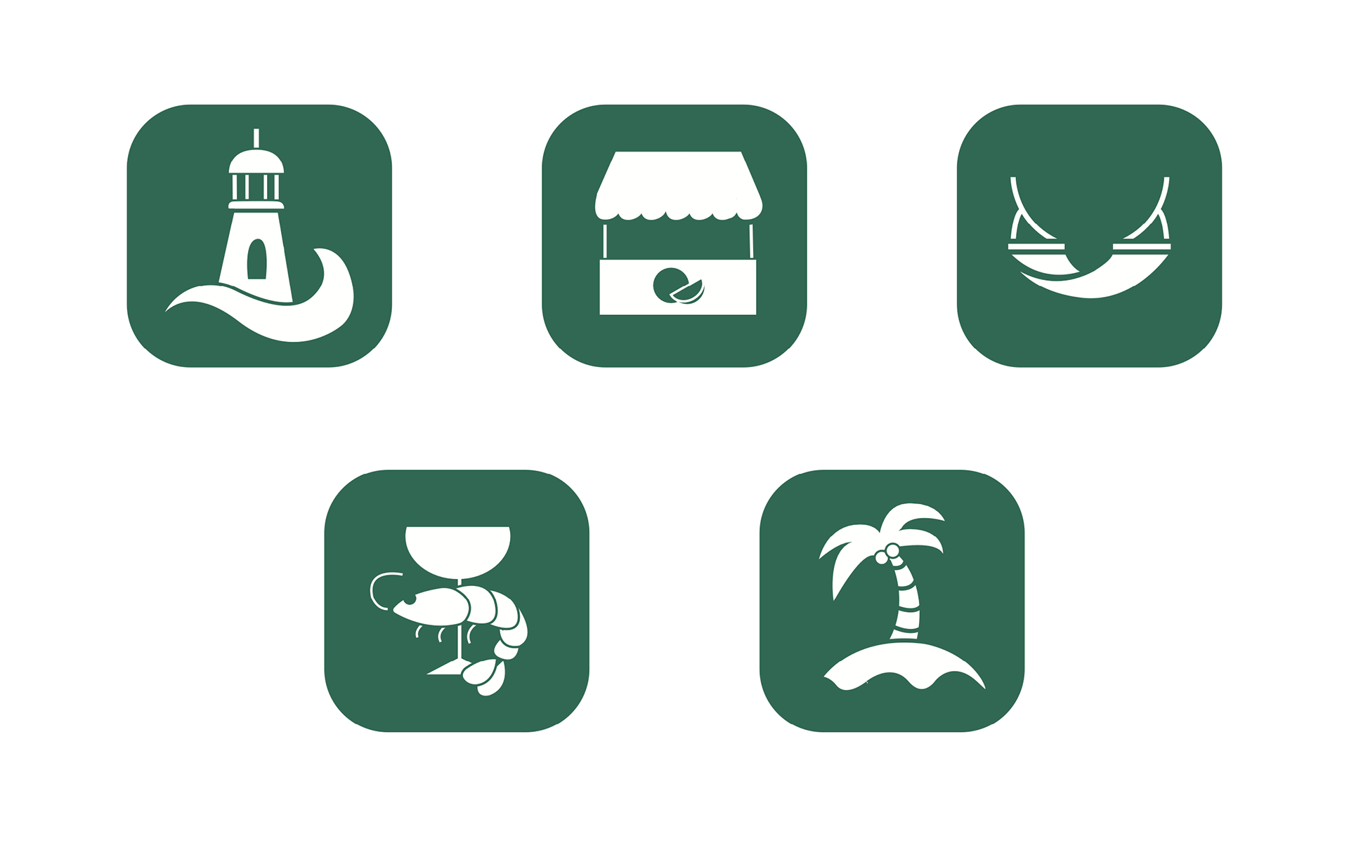 For this project, we also had to come up with a set of symbols for signage. The goal was to create illustrations that could be understood by anyone, no matter the language barrier. The symbols I felt were most important for tourists were, historical landmark, dining, market, beach, and lodging.