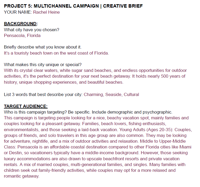 My main goals for this assignment was to make my city branding fun, inviting, and show that Pensacola is the perfect spot for tourists to visit if they're looking to relax.