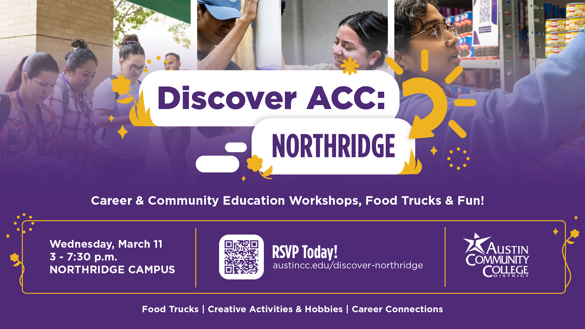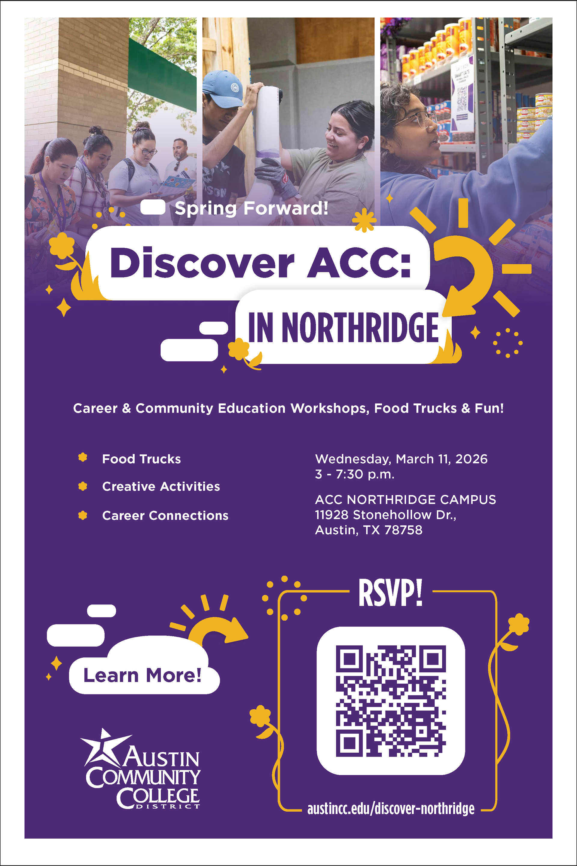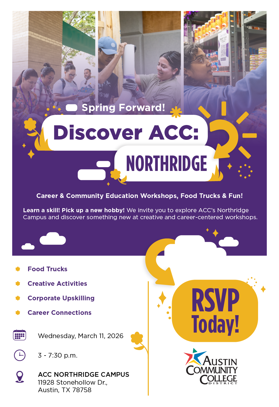 Discover ACC is an event that invites the community to a special college exploration night, spreading the word of the various programs ACC offers. Including food, fun, and demonstrations from different interesting program fields. My assignment was to create a full graphics package, advertising the event. My goal was to keep it looking similar to the past events but with a spring themed twist.
